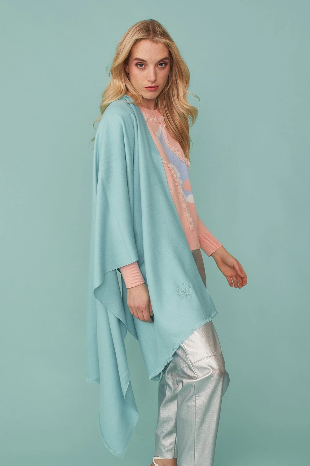 JAYLEY Cashmere Blend Wrap In Baby Blue With Fringed Hem And Logo