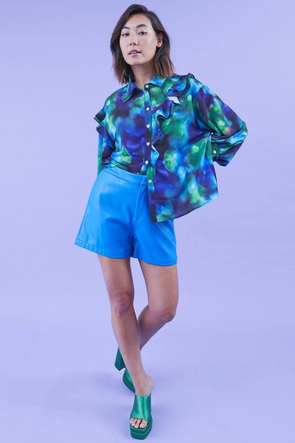Keep cool in our sweet shirt featuring a gorgeous blue and green design, perfect for all year round. Classic collar and button up front and a dip hem.