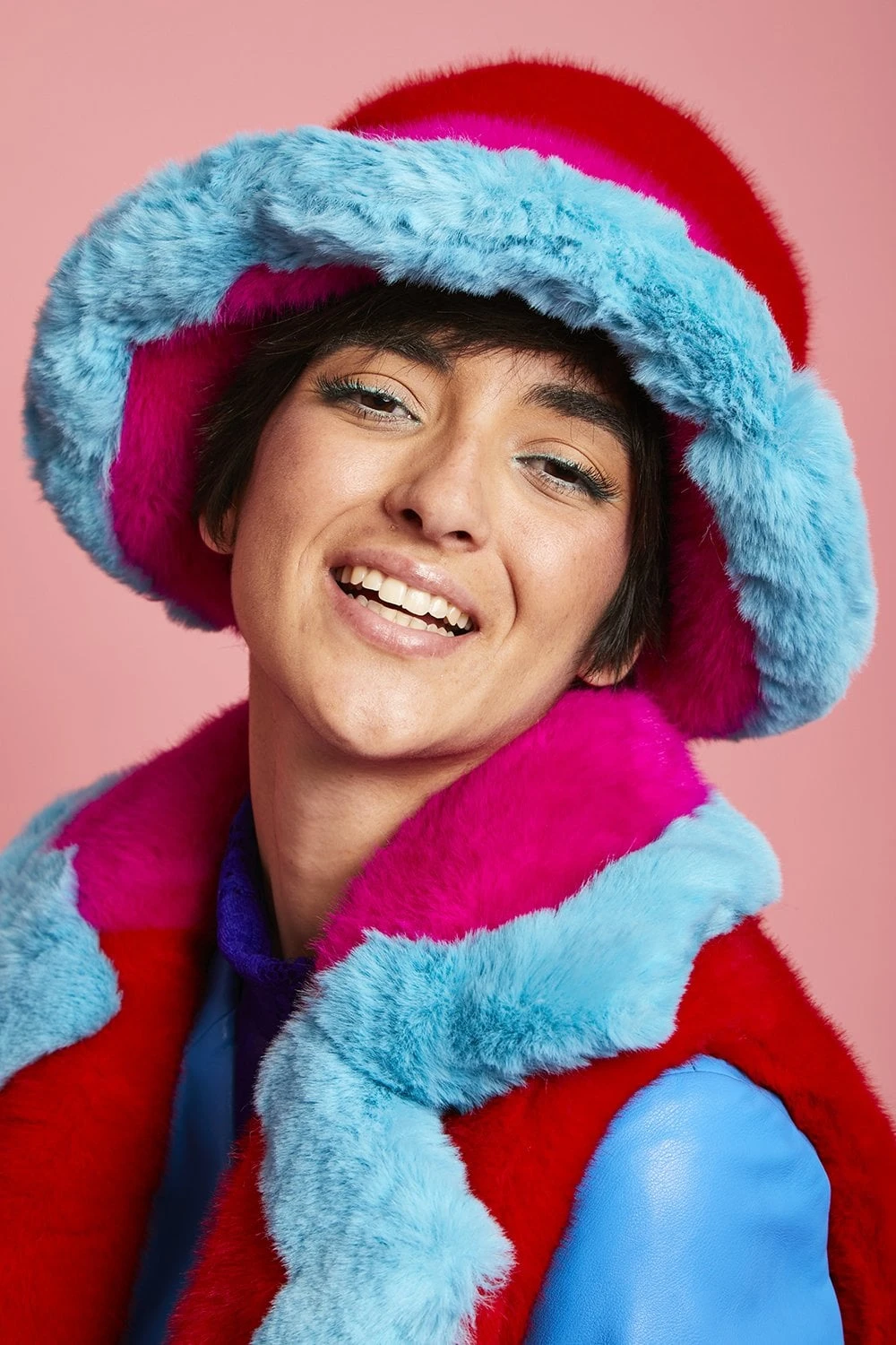 Add a touch of vibrant colour to your look with this gorgeous faux fur gilet with a classic collar. In a patchwork style, this gilet features 3 bold tones including an electric blue to brighten the front outline of the design. This coat has button front fastening and pockets.