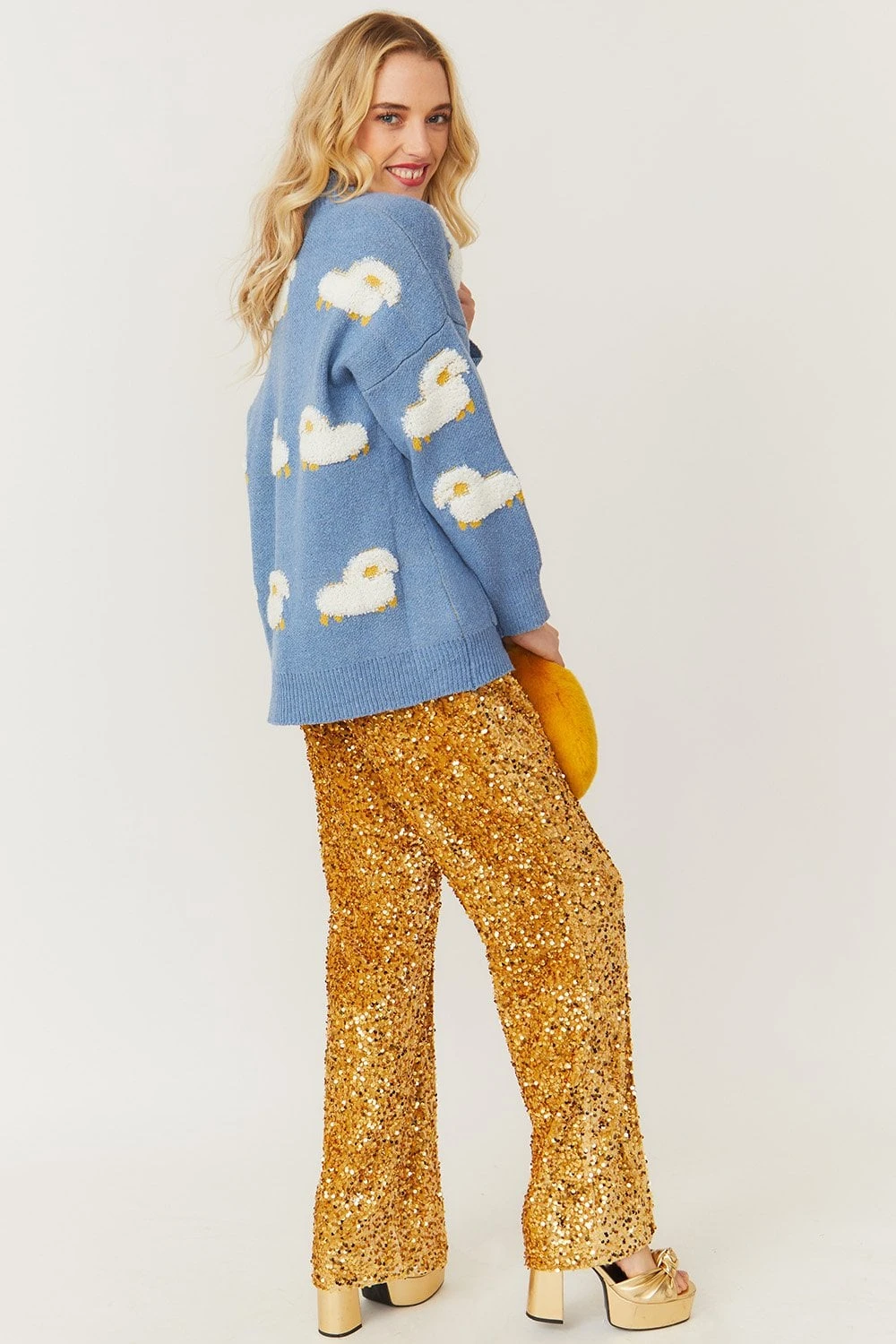 Gold-tone velvety embellished flared trousers featuring sequin embroidery, a high elasticated waist, silk lining and pockets.