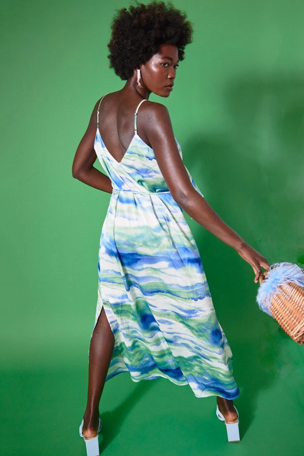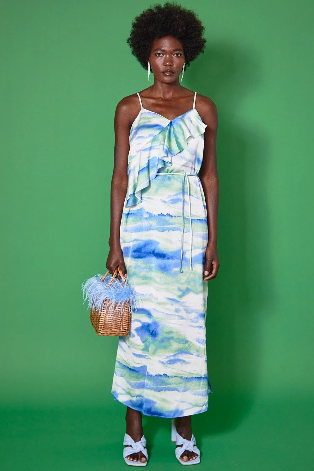 Perfect for your Summer plans this gorgeous cami maxi dress features a ruffle neckline, tie waist and split hem.