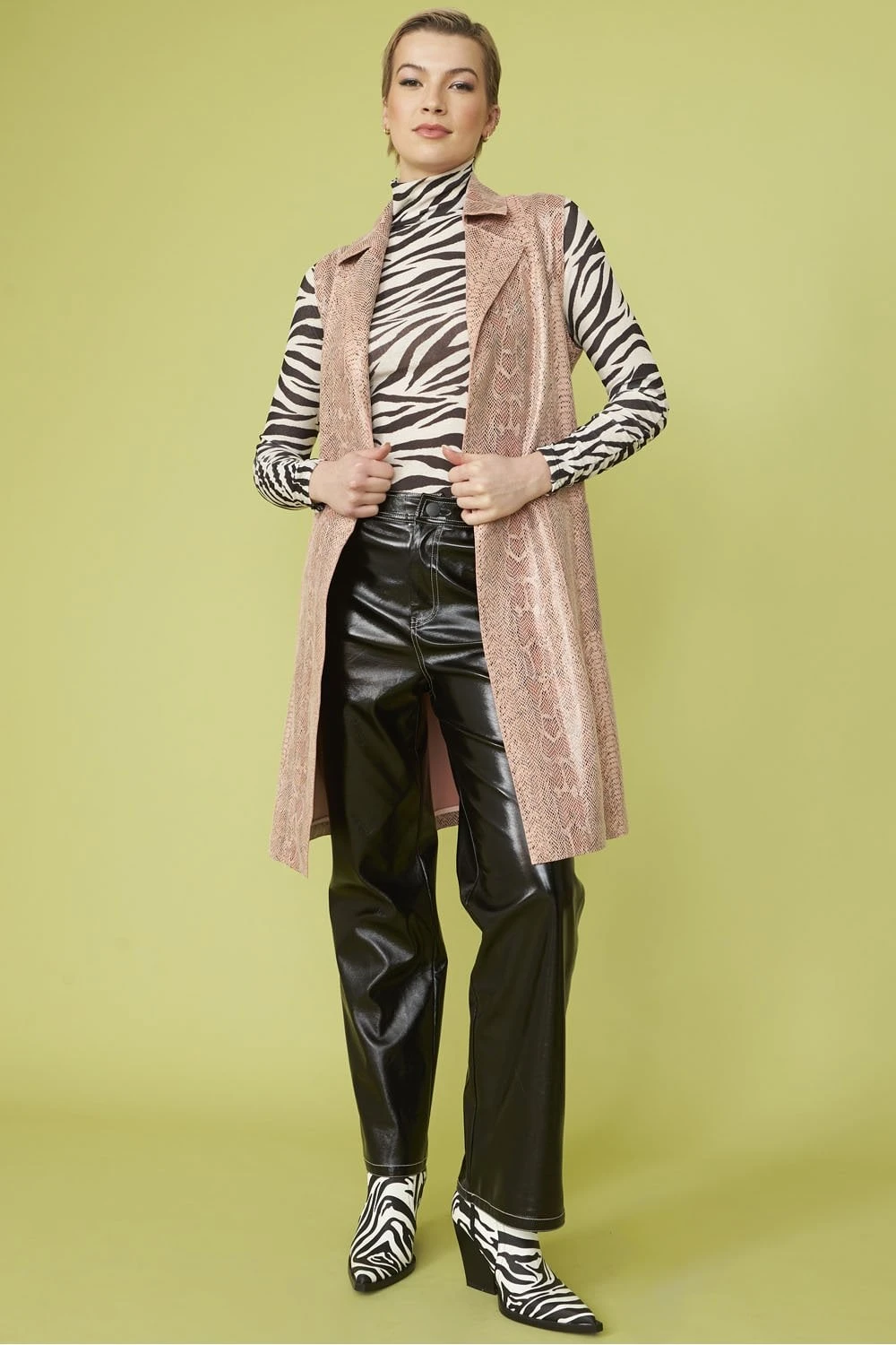 This faux suede waistcoat is cut to a flattering mid-length and boasts a classical cut shape with peaked lapels. Featuring a subtle snake print design, this gilet is ideal for this season as it’s not only lightweight but water resistant too. Just in case you get caught in a shower.