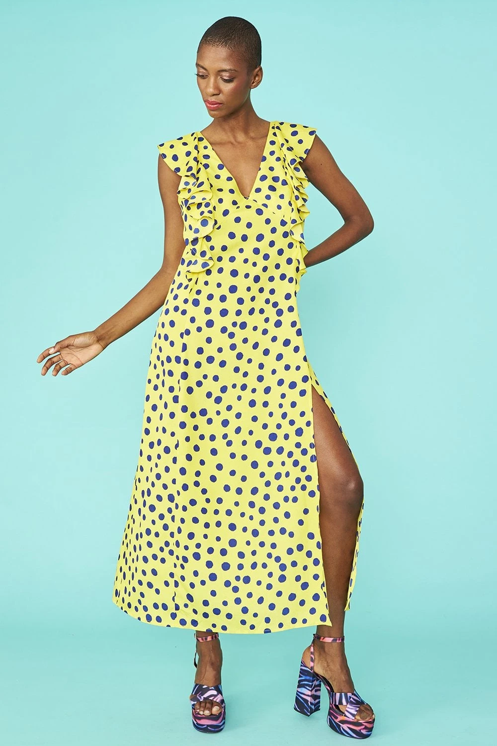 It’s super easy to make a style statement in this spectacular polka dot print dress! We’ve added a figure-flattering structure with Capped sleeves, V neckline, Ruffle detailing and a front split! This sophisticated dress is definitely a wardrobe must-have!