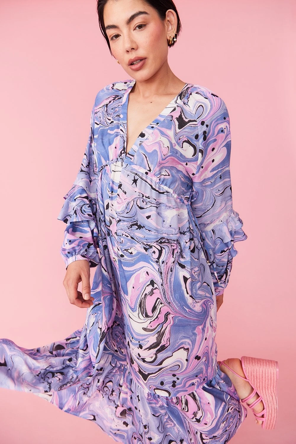 The perfect transitional piece, our purple abstract dress is just what you need for this season. Featuring full-length sleeves and a floaty silhouette and a ruched V neckline. This dress really is the wow factor!